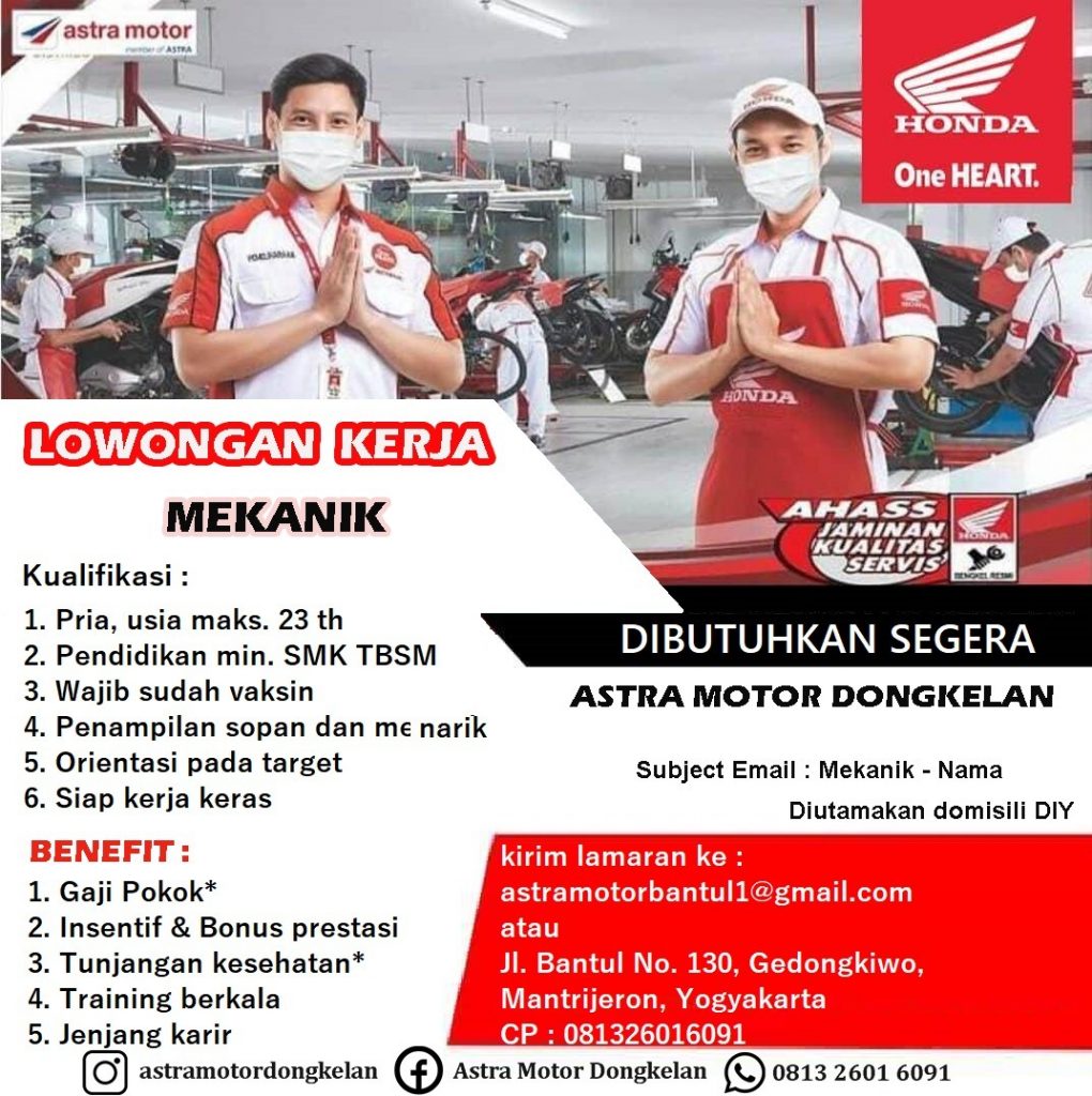 Info lowongan pekerjaan, Astra Motor dongkelan membutuhkan mekanik untuk bengkel mereka didaerah dongkelan. Loker tersebut tidak kolektif sekolah, silahkan yang berminat bisa mendaftar dengan mengirimkan CV dan lamaran langsung ke alamat perusahaan, lowongan ditutup setelah kuota terpenuhi. SMK BISA-HEBAT !!!