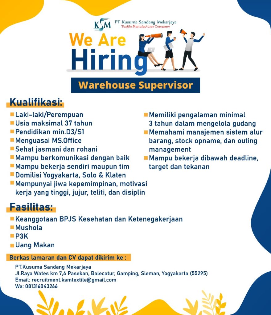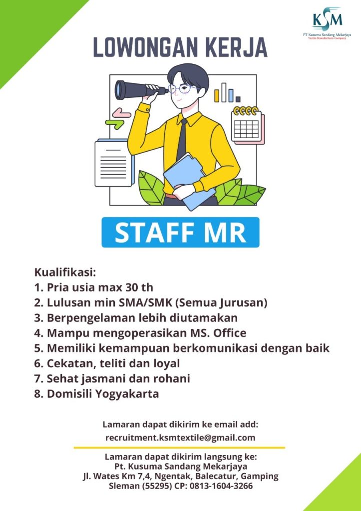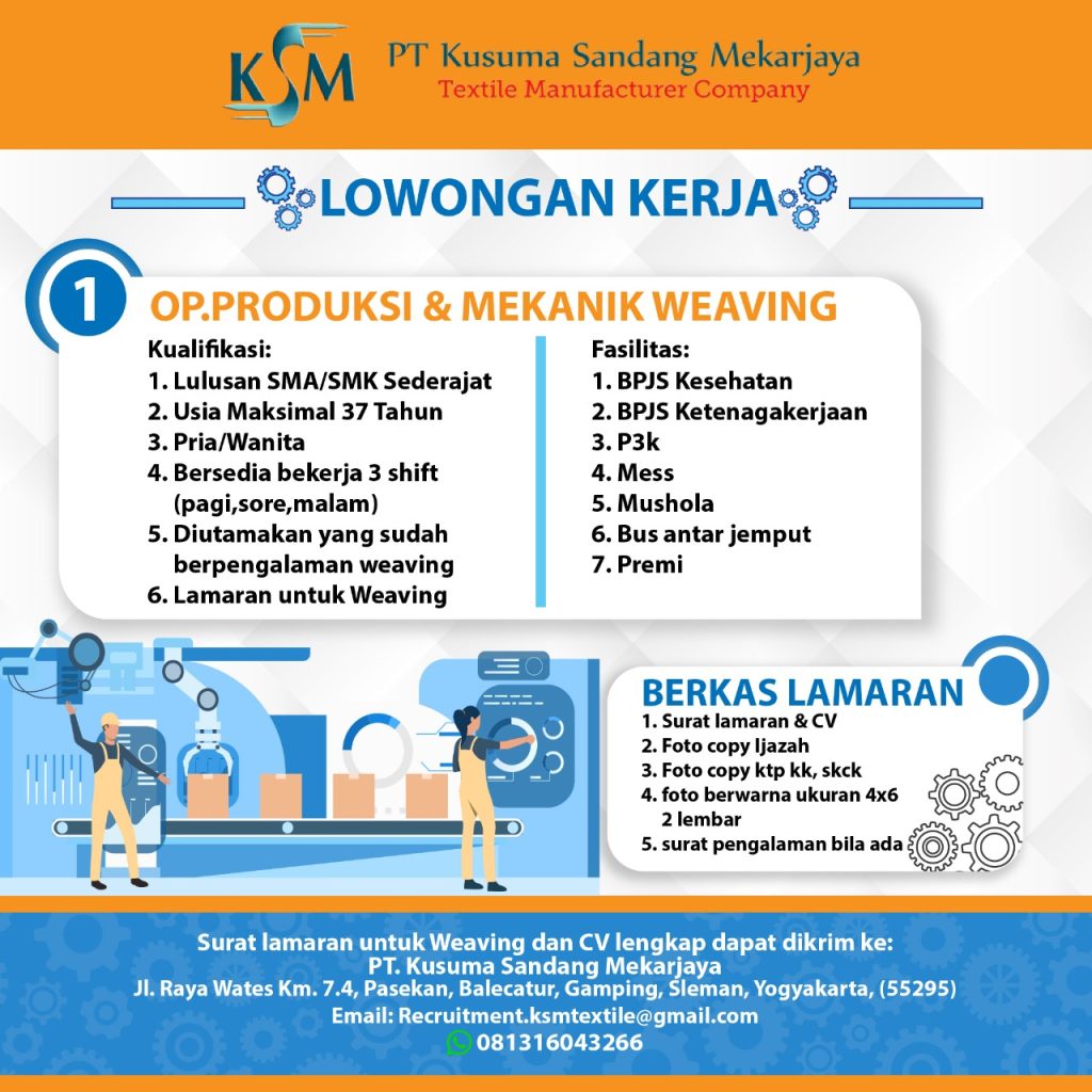 Info lowongan pekerjaan, PT Kusuma Sandang Mekarjaya Yogyakarta membutuhkan tenaga Warehouse Supervisor, Staff MR, Operator Produksi & Mekanik Weaving. Lowongan pekerjaan tersebut tidak kolektif sekolah, silahkan yang berminat bisa mendaftar dengan mengirimkan CV dan surat lamaran langsung ke alamat perusahaan atau melalui email yang tertera di leaflet. Batas lowongan pekerjaan sampai kuota terpenuhi. SMK BISA-HEBAT !!!