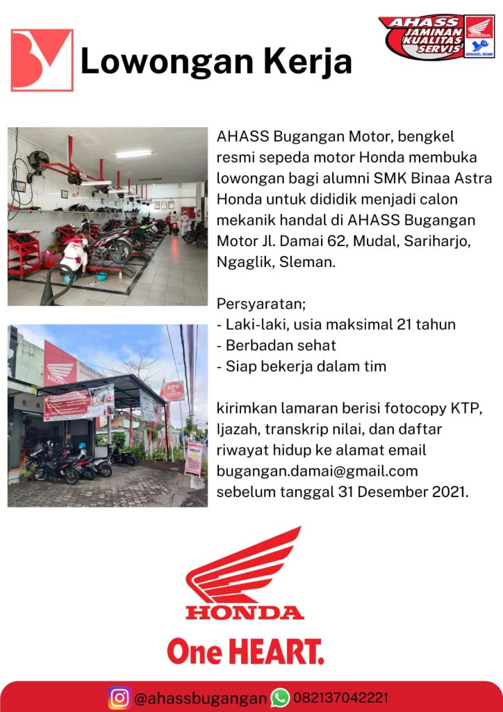 Info lowongan pekerjaan, AHASS Bugangan Motor Sleman membutuhkan tenaga Mekanik. Lowongan pekerjaan tersebut tidak kolektif sekolah, silahkan yang berminat bisa mendaftar dengan mengirimkan CV dan lamaran melalui email perusahaan yang tertera di leaflet. Batas pengiriman berkas sebelum tanggal 31 Desember 2021. SMK BISA-HEBAT !!!