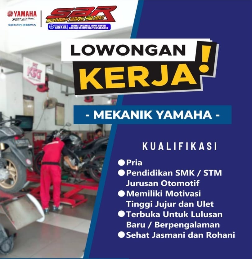 Info lowongan pekerjaan, Yamaha Sumber Baru Rejeki membutuhkan tenaga untuk menjadi mekanik sepeda motor yamaha . Lowongan pekerjaan diatas kolektif sekolah. Silahkan yang berminat bisa menghubungi BKK SMK Muhammadiyah 3 Yogyakarta/Pak Arif (085726088819). SMK BISA-HEBAT !!!