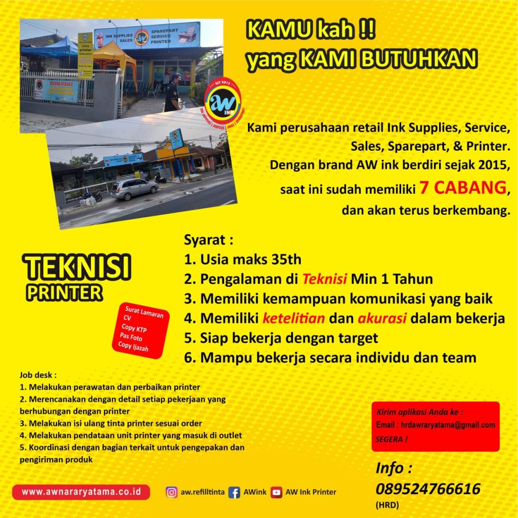 Info lowongan pekerjaan, CV. Awnararyatama membutuhkan tenaga untuk posisi Teknisi Printer yang nantinya akan ditempatkan di Yogyakarta. Lowongan pekerjaan diatas kolektif sekolah melalui BKK SMK Muhammadiyah 3 Yogyakarta. Silahkan yang berminat bisa menghubungi BKK kami di 085726088819 (pak Arif), lowongan ini ditutup hari Sabtu, 14 Mei 2022 pukul 10.00 pagi. SMK BISA-HEBAT !!!