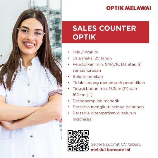Info lowongan pekerjaan, Optik Melawai membutuhkan tenaga untuk posisi sales counter optik. Lowongan pekerjaan diatas tidak kolektif sekolah. Silahkan yang berminat bisa mengikuti prosedur pendaftaran di pusat informasi yg tertera di leaflet, lowongan ini ditutup setelah kuota terpenuhi. SMK BISA-HEBAT !!!