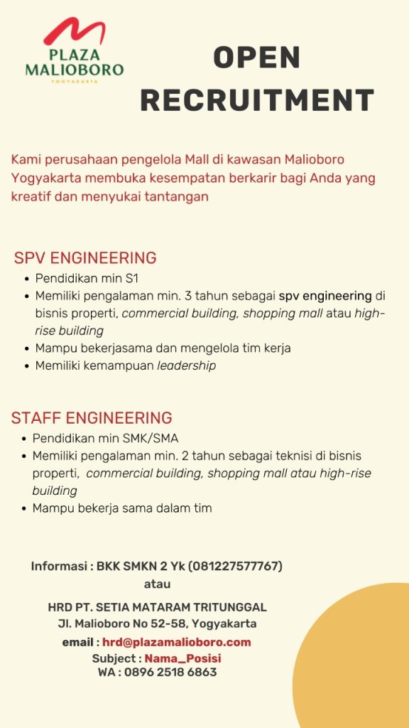 Info lowongan pekerjaan diatas tidak kolektif sekolah, silahkan yang berminat bisa mengikuti prosedur pendaftaran di pusat informasi yg tertera di leaflet, lowongan pekerjaan ditutup 10 November 2022. Silahkan secepatnya manfaatkan kesempatan ini. SMK BISA-HEBAT !!!