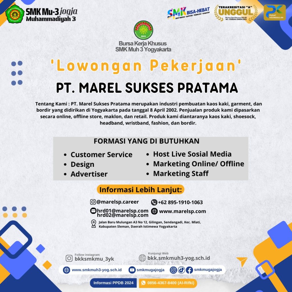 INFORMASI LOWONGAN PEKERJAAN DARI PT MAREL SUKSES PRATAMA. tidak kolektif dengan sekolah. silahkan yang berminat bisa mengikuti prosedur pendaftaran di pusat informasi yang tertera di leaflet, silahkan secepatnya manfaatkan kesempatan ini. SMK BISA-HEBAT!!!