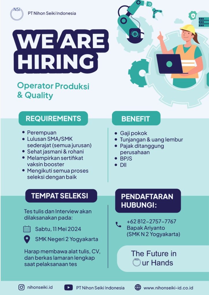 Info lowongan pekerjaan dari PT Nihon Seiki diatas kolektif sekolah, silahkan yang berminat dan memenuhi kriteria untuk segera mendaftar (UNTUK SEMUA JURUSAN). Yang berminat silahkan menghubungi admin. Silahkan secepatnya manfaatkan kesempatan ini. SMK BISA-HEBAT!!!