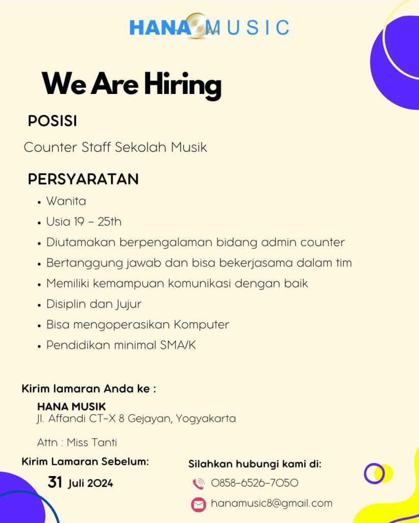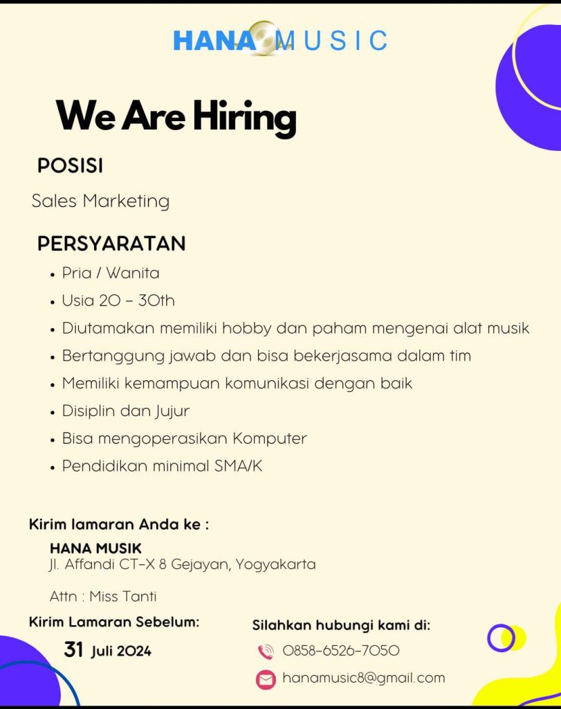 Info lowongan pekerjaan dari Hana Musik tidak kolektif sekolah, silahkan yang berminat dan memenuhi kriteria untuk segera mendaftar. Yang berminat silahkan ikuti prosedur pendaftaran di leaflet sebelum tanggal 31 Juli 2024. Silahkan secepatnya manfaatkan kesempatan ini. SMK BISA-HEBAT!!!