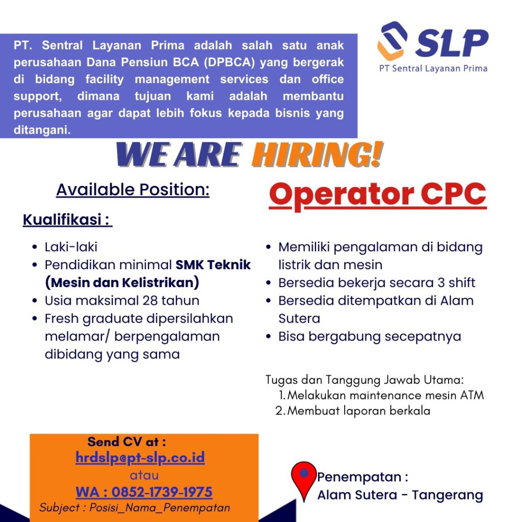 Info lowongan pekerjaan dari PT Sentral Layanan Prima tidak kolektif sekolah, silahkan yang berminat dan memenuhi kriteria untuk segera mendaftar. Yang berminat silahkan ikuti prosedur pendaftaran di leaflet. Silahkan secepatnya manfaatkan kesempatan ini. SMK BISA-HEBAT!!!
