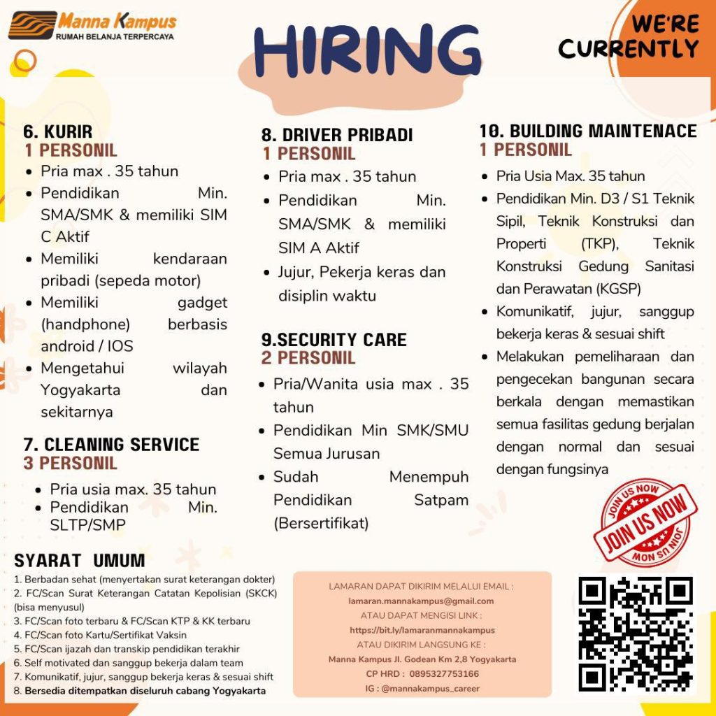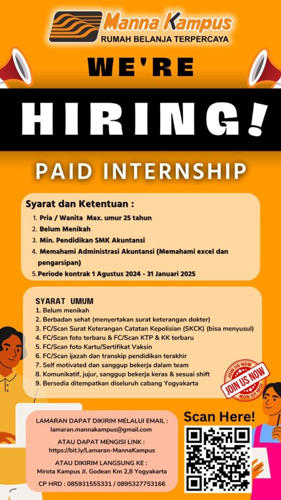 Info lowongan pekerjaan dari Manna Kampus tidak kolektif sekolah, silahkan yang berminat dan memenuhi kriteria untuk segera mendaftar. Yang berminat silahkan ikuti prosedur pendaftaran di leaflet dan mengisi link form https://bit.ly/lamaranmannakampus . Silahkan secepatnya manfaatkan kesempatan ini. SMK BISA-HEBAT!!!