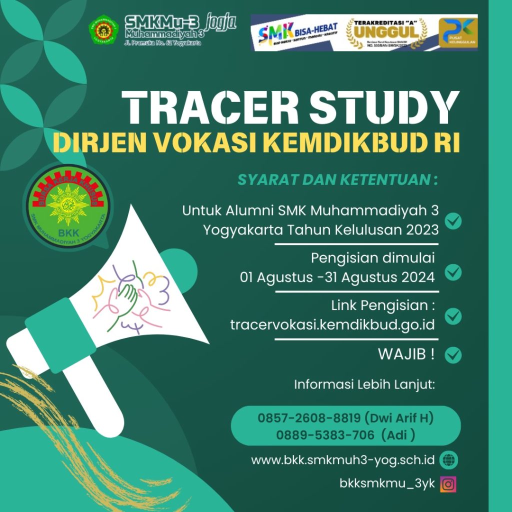 Kami dari Bursa Kerja Khusus (BKK) SMK Muhammadiyah 3 Yogyakarta mendapatkan pemberitahuan Direktorat Jenderal Pendidikan Vokasi, KEMDIKBUD untuk melaksanakan tracer study/penelusuran tamatan lanjutan untuk alumni kelulusan tahun 2023 baik yang bekerja, kuliah, wirausaha maupun belum bekerja. Banyak fungsi dari penelusuran tersebut, salah satunya KEMDIKBUD akan memetakan dan memasarkan tamatan.