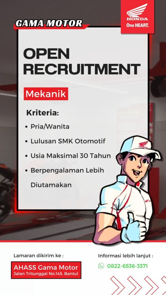 Info lowongan pekerjaan dari Ahass Gama Motor tidak kolektif sekolah, silahkan yang berminat dan memenuhi kriteria untuk segera mendaftar. Yang berminat silahkan ikuti prosedur pendaftaran di leaflet. Setelah mendaftar harap konfirmasi ke admin untuk kami laporkan ke HRD. Silahkan secepatnya manfaatkan kesempatan ini. SMK BISA-HEBAT!!!