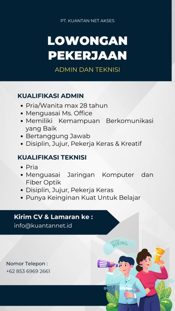 Info lowongan pekerjaan dari PT. KUANTAN NET AKSES tidak kolektif sekolah, silahkan yang berminat dan memenuhi kriteria untuk segera mendaftar. Yang berminat silahkan ikuti prosedur pendaftaran di leaflet. Setelah mendaftar harap konfirmasi ke admin untuk kami laporkan ke HRD. Silahkan secepatnya manfaatkan kesempatan ini. SMK BISA-HEBAT!!!