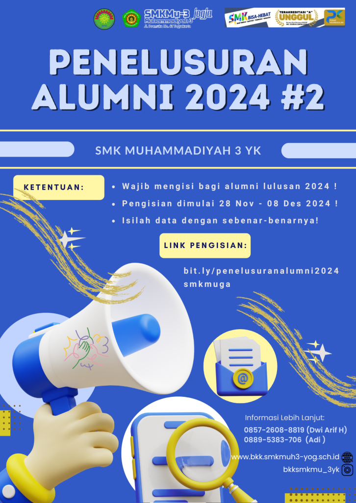 Kami dari Bursa Kerja Khusus (BKK) SMK Muhammadiyah 3 Yogyakarta menyelenggarakan program penelusuran alumni. Banyak manfaat dari penelusuran tersebut. Untuk itu kami mewajibkan alumni tahun kelulusan 2024 baik yang bekerja, kuliah, wirausaha maupun belum bekerja untuk bersedia mengisi link google form berikut ini :