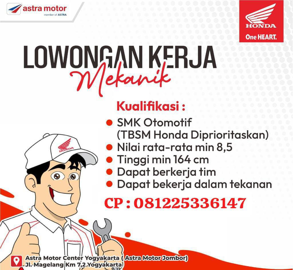 Info lowongan pekerjaan dari ASTRA MOTOR JOMBOR tidak kolektif sekolah, silahkan yang berminat dan memenuhi kriteria untuk segera mendaftar. Yang berminat silahkan hubungi admin untuk kami laporkan ke HRD. Silahkan secepatnya manfaatkan kesempatan ini. SMK BISA-HEBAT!!!