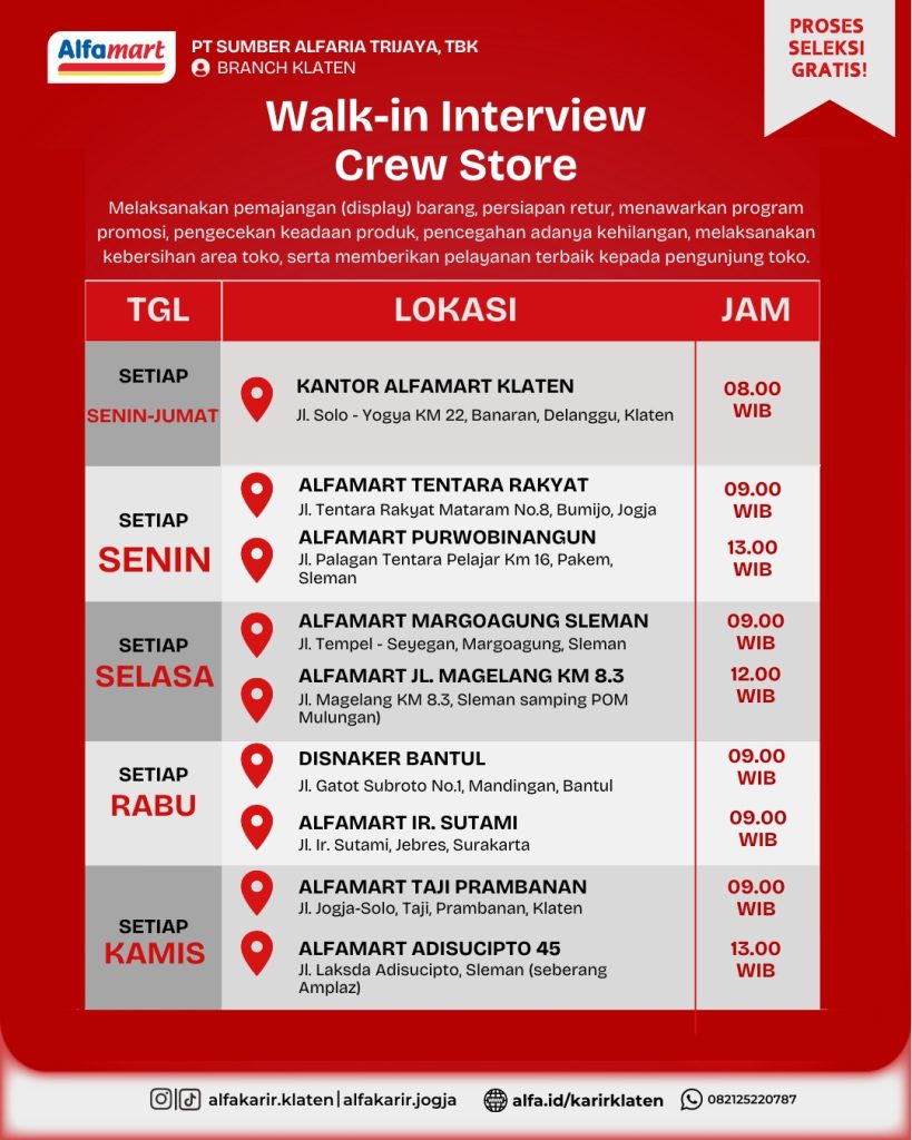 Info lowongan pekerjaan dari Crew Store Alfamart tidak kolektif sekolah, silahkan yang berminat dan memenuhi kriteria untuk segera mendaftar. Yang berminat silahkan hubungi admin untuk kami laporkan ke HRD. Silahkan secepatnya manfaatkan kesempatan ini. SMK BISA-HEBAT!!!