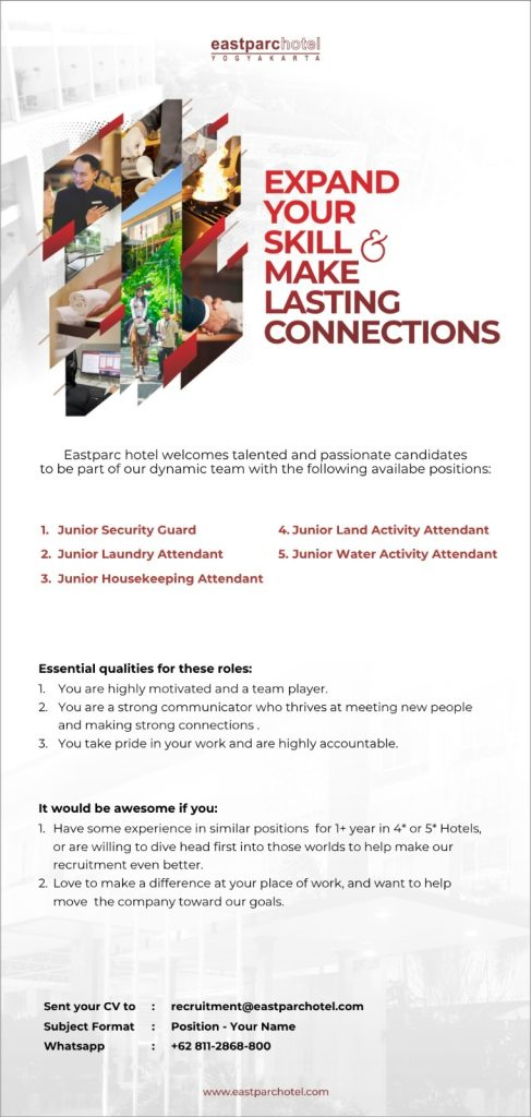 Info lowongan pekerjaan dari Eastparc Hotel Yogyakarta tidak kolektif sekolah, silahkan yang memenuhi kriteria untuk segera mendaftar. Yang berminat silahkan kirimkan surat lamaran dan CV ke email yang tertera di leaflet. Silahkan secepatnya manfaatkan kesempatan ini. SMK BISA-HEBAT!!!