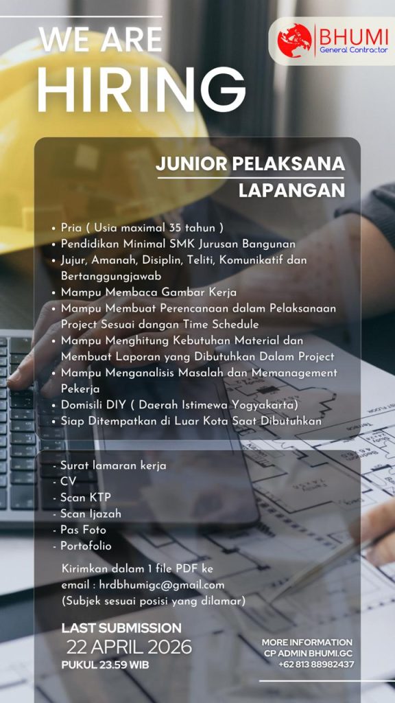 Info lowongan pekerjaan dari Bhumi General Contractor kolektif sekolah, silahkan yang memenuhi kriteria untuk segera mendaftar. Yang berminat silahkan kirimkan surat lamaran dan CV ke alamat email kemudian hubungi admin untuk kami data yang tertera di leaflet. Silahkan secepatnya manfaatkan kesempatan ini. SMK BISA-HEBAT!!!