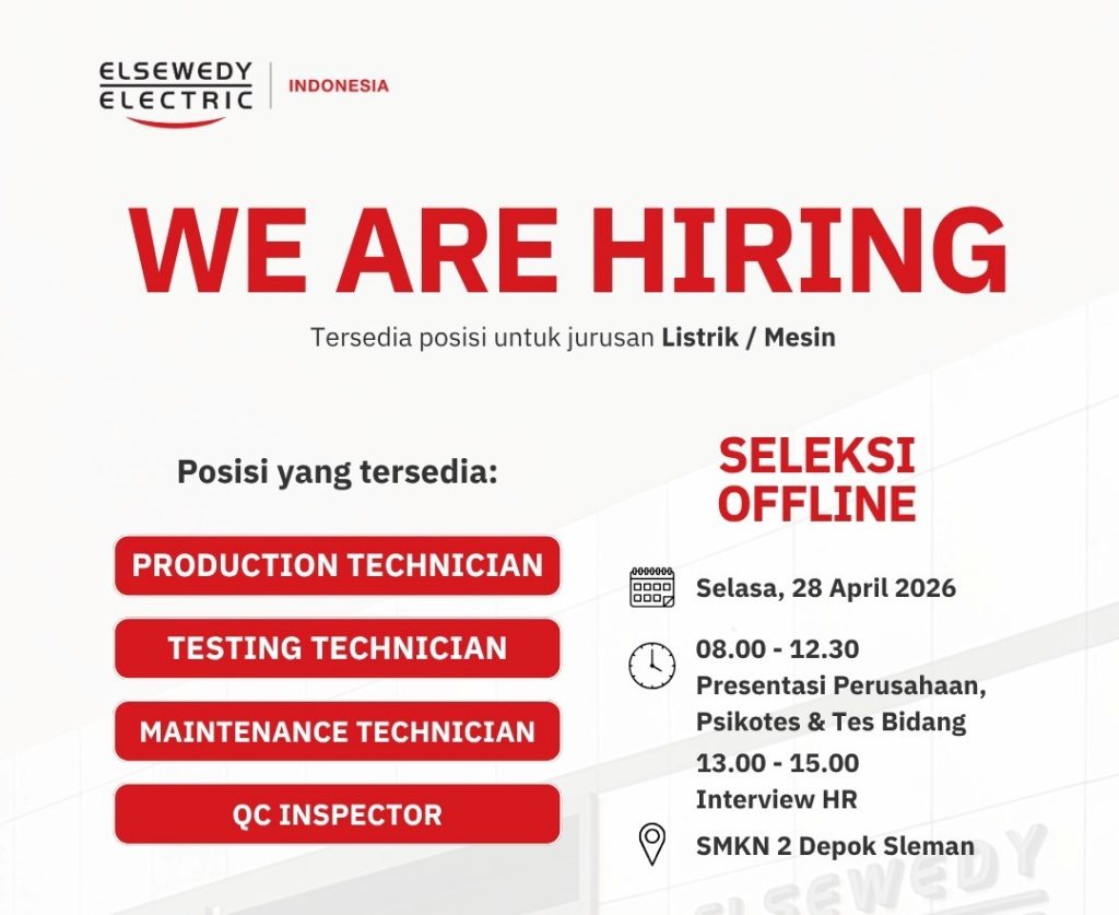 Info lowongan pekerjaan dari PT. Elsewedy Electric tidak kolektif sekolah, silahkan yang memenuhi kriteria untuk segera mendaftar. Yang berminat silahkan isi link formnya maksimal 24 April 2026 kemudian hubungi admin untuk kami data yang tertera di leaflet. Silahkan secepatnya manfaatkan kesempatan ini. SMK BISA-HEBAT!!!