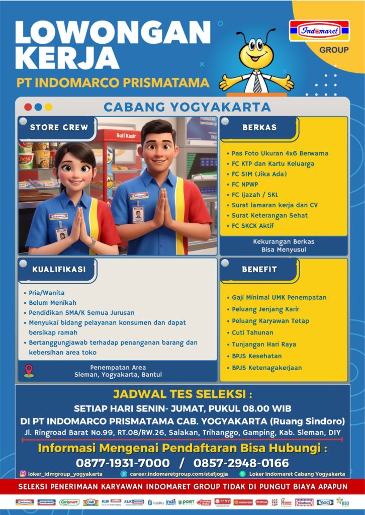 Info lowongan pekerjaan dari PT Indomarco Prismatama tidak kolektif sekolah, silahkan yang memenuhi kriteria untuk segera mendaftar. Yang berminat silahkan kirimkan surat lamaran dan CV ke alamat email kemudian hubungi admin untuk kami data yang tertera di leaflet. Silahkan secepatnya manfaatkan kesempatan ini. SMK BISA-HEBAT!!!